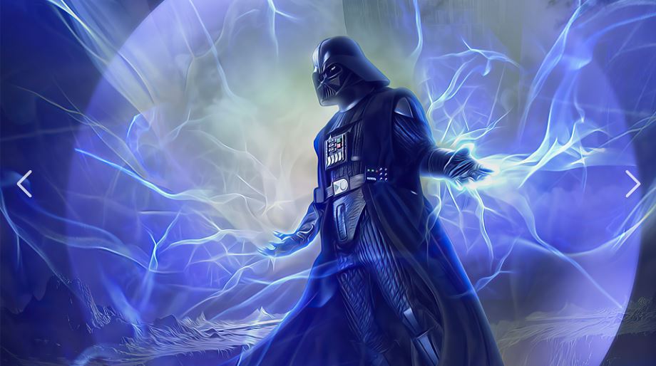 A dramatic portrayal of Darth Vader amidst a storm of energy, embodying his immense strength.